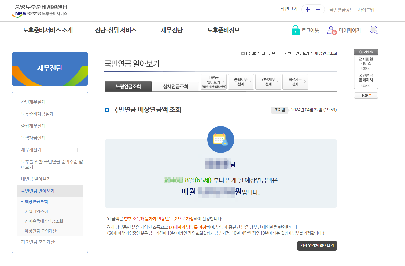 보다 정확한 수령액을 확인하시려면, 국민연금공단 홈페이지에 공인인증서나 PASS 등을 이용하여 로그인 한 후