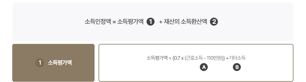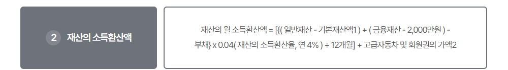 소득인정액 요건: 단독 가구의 경우 월 2,130,000원, 부부 가구의 경우 월 3,408,000원 이하여야 하며, 소득과 재산을 합산하여 계산합니다.