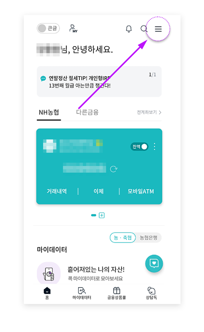 사용자 계좌 화면에서 우측 상단의 더 보기(삼선 아이콘)를 선택합니다.