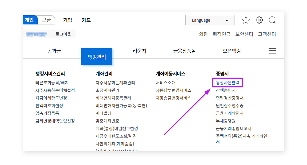 '뱅킹관리' 카테고리에서 증명서의 하단 메뉴 '통장사본출력'을 선택합니다.