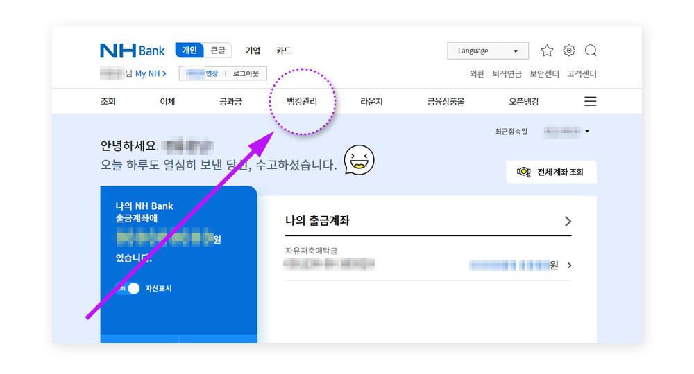 로그인 후, 화면 상단의 '뱅킹관리' 카테고리를 선택합니다.