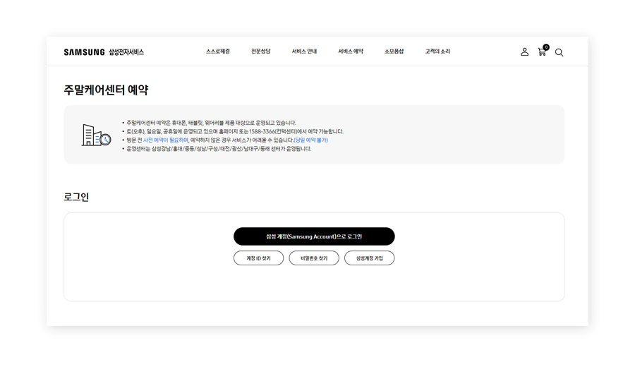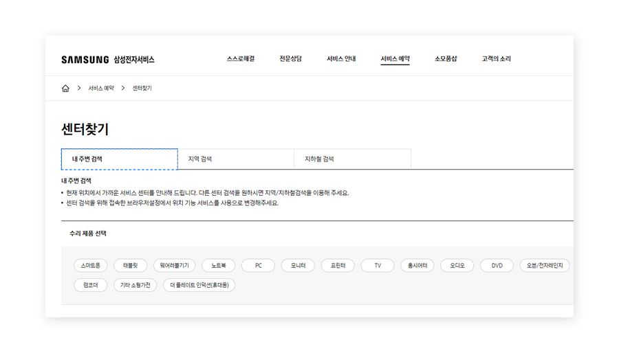 - '서비스 센터 찾기' 버튼 클릭 후 삼성전자 서비스 센터 페이지로 이동