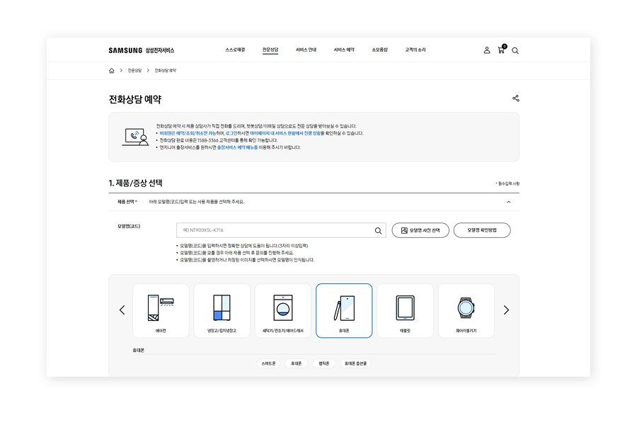 - '전문상담' > '전화상담 예약' 페이지에서 제품 정보와 증상 입력
