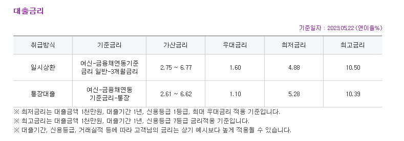 - 금리: 일시 상환 시 4.88% ~ 10.5% (우대 금리 적용 시)