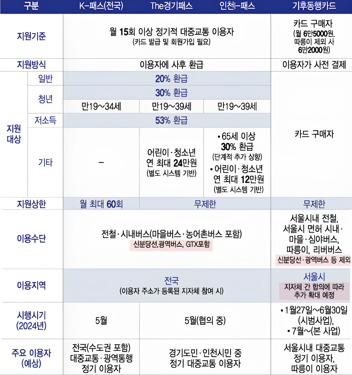 K패스, The경기패스카드, 기후동행카드 비교