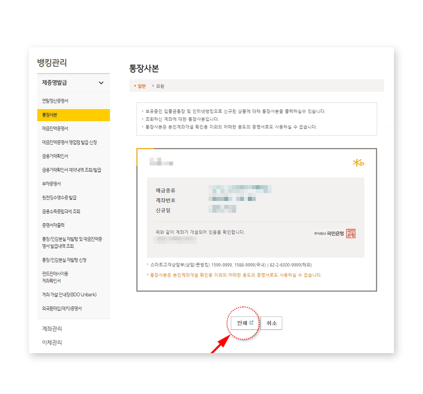 화면에 표시된 통장사본을 바로 인쇄하거나 PDF 파일로 저장할 수 있습니다.