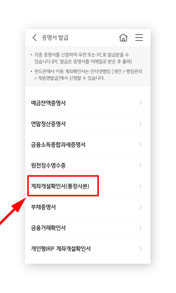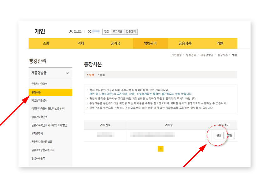 '계좌개설확인서(통장사본)' 메뉴를 선택하고 필요한 계좌를 선택합니다. 계좌 종류, 발급 언어(한글 또는 영어)를 선택한 후 발급을 진행합니다.