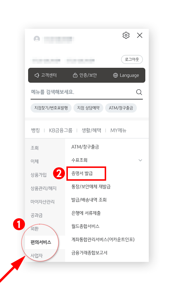 앱에서 '편의서비스' > '증명서 발급' 메뉴를 찾아 들어갑니다. (메뉴검색에서 증명서 발급 검색 가능)